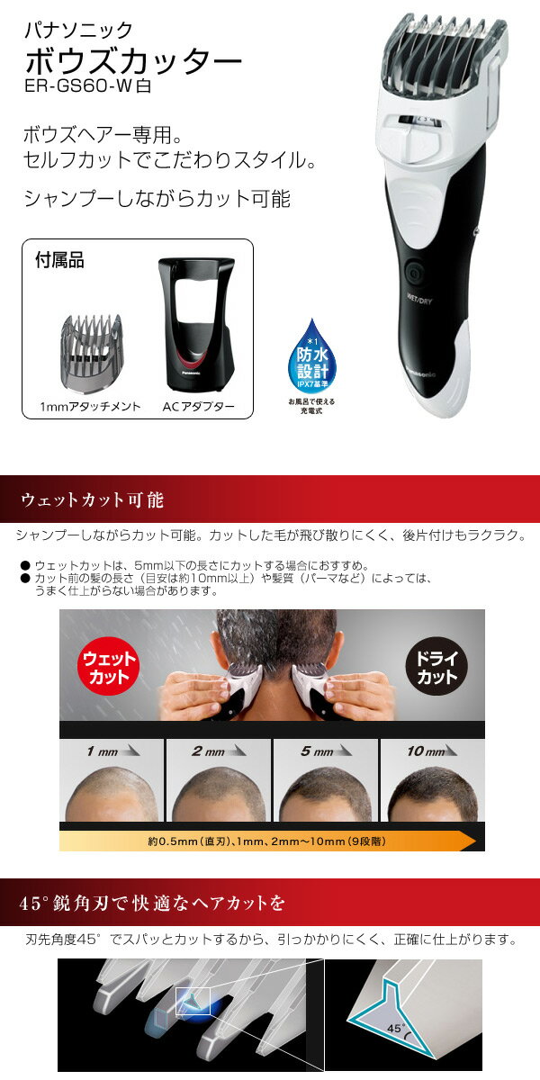 パナソニック(Panasonic) ボウズカッター ER-GS60-W 白 本体サイズ 幅4.8×奥行4.1×高さ17.6cm 重量0.14kg 仕様 ●原産国:中国 商品説明 ●電源:AC100V●電源方式:充電式●充電時間:12時間●消費電力:(充電時)約0.5W●使用時間の目安:連続約40分間使用可能●電池種類:ニッケル水素電池●水洗いOK●ボウズヘアー専用、セルフカットでこだわりスタイル●シャンプーしながらカット可能、カットした毛が飛び散りにくい●切れ味の良い40度鋭角刃で正確な仕上がり●刃をはずさず洗えるウォータースルー洗浄●付属品:1mmアタッチメント、刈り高さアタッチメント、ACアダプター、専用オイル、掃除用ブラシ 商品補足説明 YAMAZEN ヤマゼン 山善 通販 national ナショナル パナソニック Panasonic 松下電器産業 パナソニック Panasonic Beauty メンズ ボウズカッター バリカン ウエット ドライ 防水 水洗い